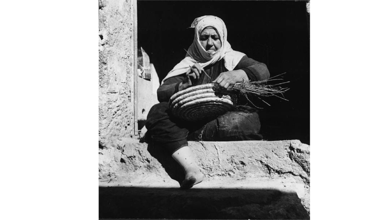 صورة لامرأة درزية تحيك سلّة قش في تاريخ 01/01/1955.