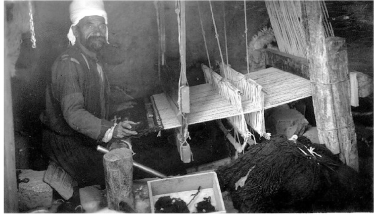 صورة لشيخ يعمل على نول صوف قديم في جبل العرب عام 1937.