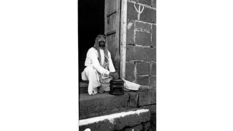 صورة لرجل من بني معروف يستعمل مهباج القهوة عام 1937 في جبل العرب.