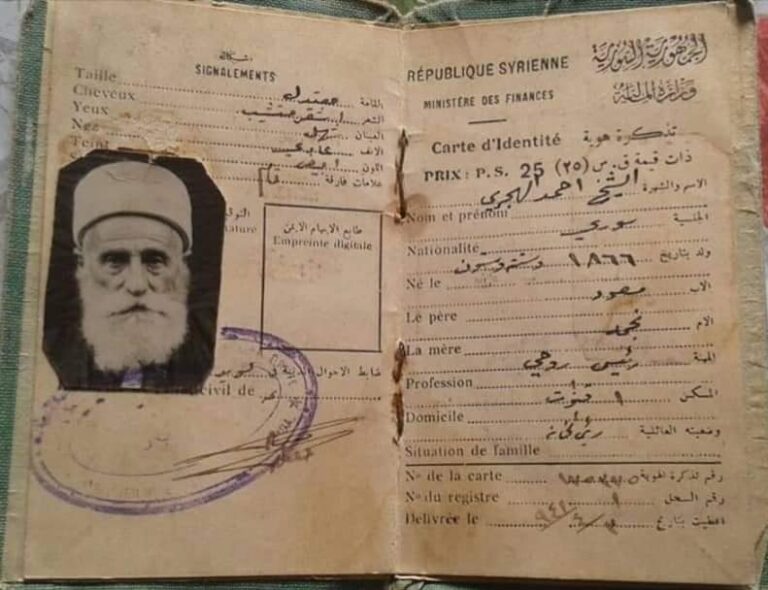 تجدون ربطاً صورة لبطاقة هوية المرحوم الشيخ أحمد الهجري من بلدة قنوات، مواليد العام 1866.