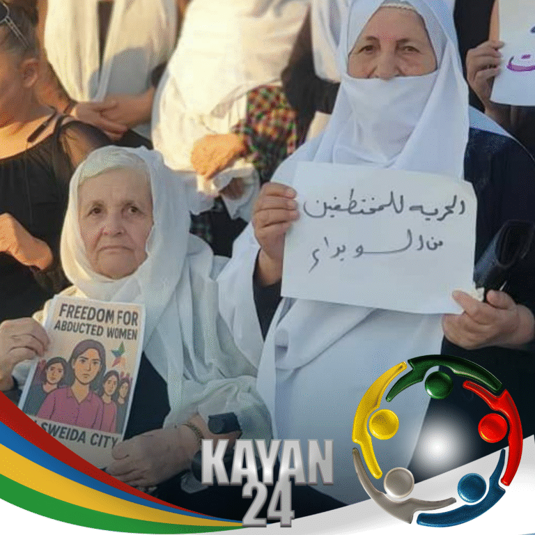 في وقفة نظمتها رئيسة هيئة تفعيل دور المرأة، تطالب بإطلاق سراح نساء وشابات السويداء، حاملة رسالة قوية للمجتمع الدولي للتحرك وضمان حريتهن